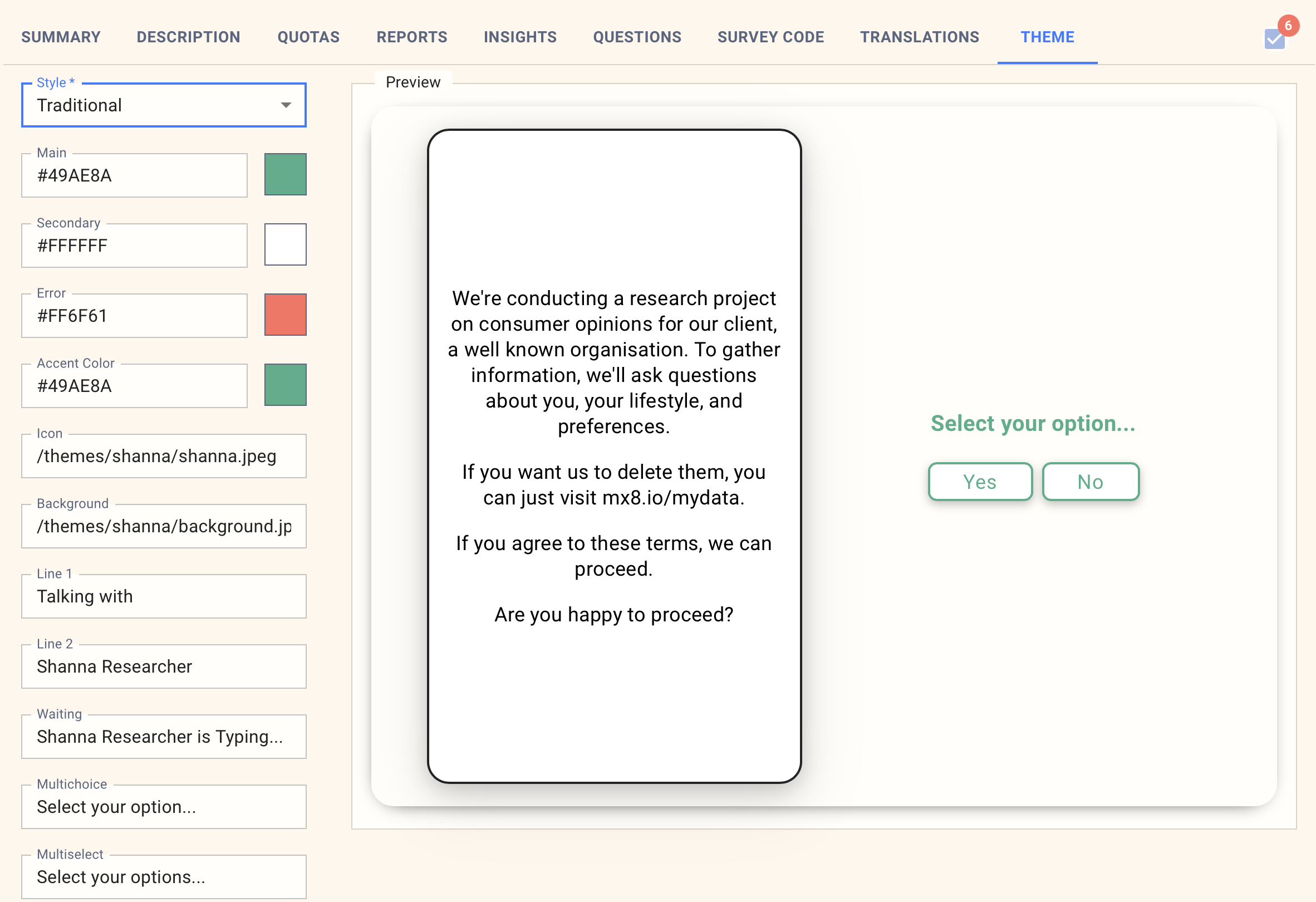 When we first the MX8 Labs research platform, we hadn't limited configuration you could provide for your surveys. Nowadays they are configurable through the theme tab: