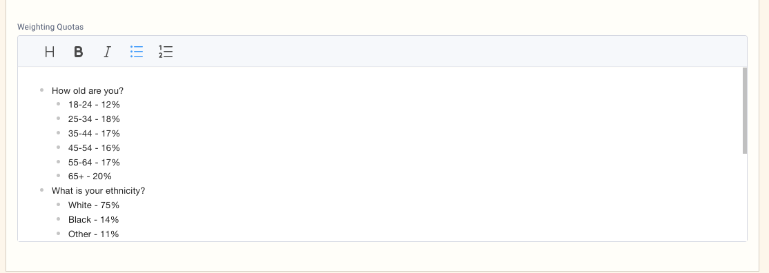 In this example, we've specified that 33% of the audience should be aged 18-24, and this means that even if only 29% of the respondents who entered your survey are aged 18-24, we'll weight them up so that in any reporting, they match the 30% that you've specified. The same applies to all the other groups.