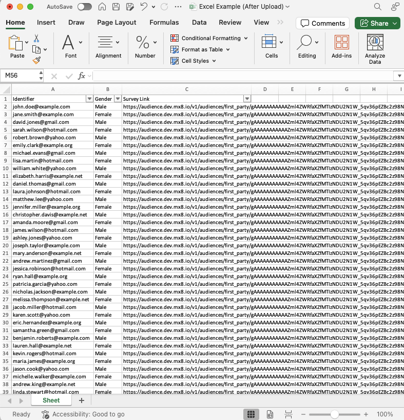 Optional columns: any other data you want to use to pre-fill survey answers (e.g. Age, Region, Customer Type, Annual Spend). These should match question codes in your survey — more on that below.