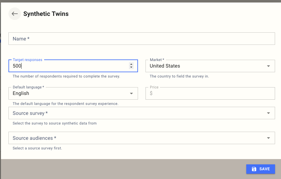 Synthetic Twins is a respondent source that generates synthetic respondents trained on responses from an existing survey. Use Synthetic Twins to extend learning from prior research without launching a new live sample.