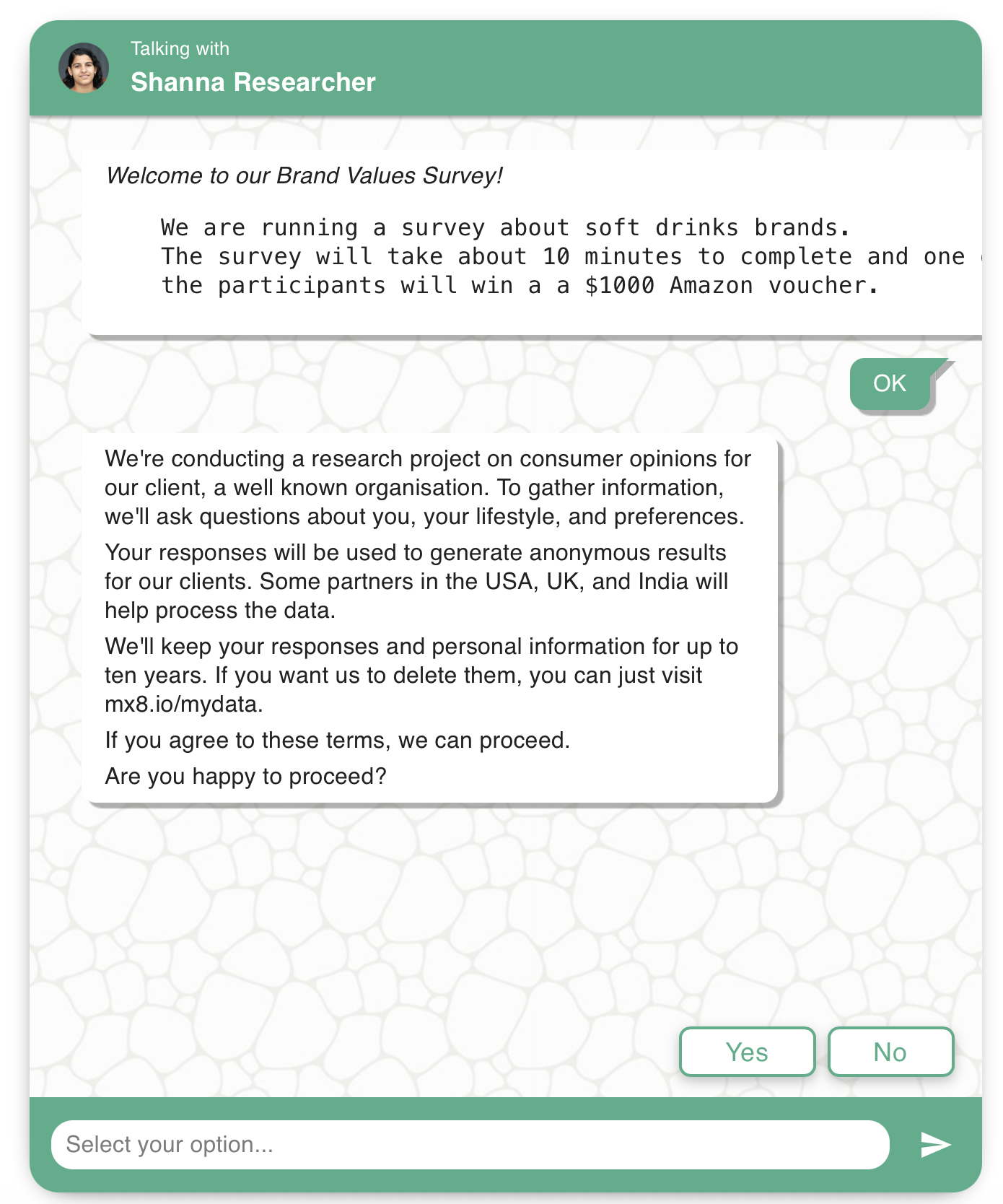 s.get_consent( consent_text="Before we begin, do you consent to participate in this study about car buying preferences?" )