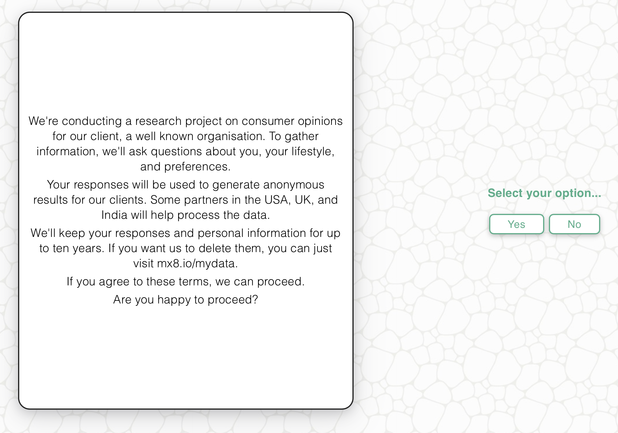 Use this to ask for explicit consent before continuing with a survey. This is typically placed at the very start of the survey to meet legal or ethical requirements. If the user does not consent, the session ends.