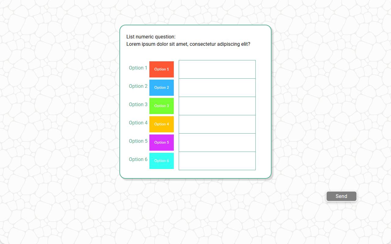 s.grid_numeric_question( "Distribute your budget across categories", row_name="Category", rows=["Food", "Housing", "Entertainment"], columns=["January", "February", "March"], recodes={ "0-30%": "Low", "31-70%": "Medium", "71-100%": "High" }, autosum_rows=True )With custom validation: