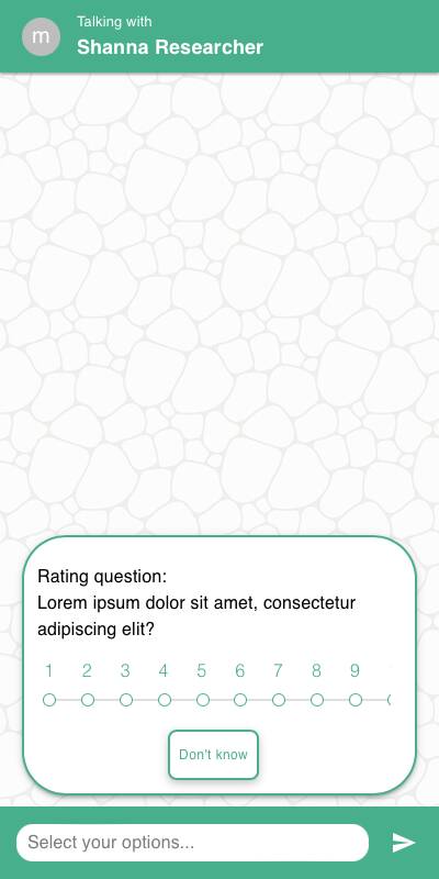 s.rating_question( "How much do you like this product?", number_of_points=5, recodes={ "1": "dislike", "2": "dislike", "3": "neutral", "4": "like", "5": "like" } )With "Don't know" and tag token: