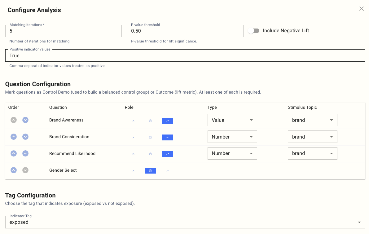 This is where the structure of the Lift analysis is defined: which questions are measured, which are used for matching, and how stimuli are interpreted.