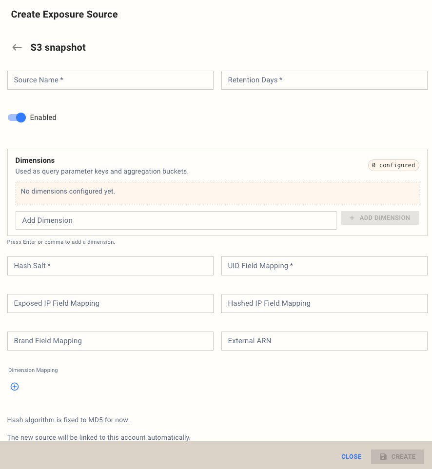 An S3 snapshot exposure source lets you upload exposure data in batch by delivering gzip-compressed CSV files to an MX8-managed S3 bucket. This is the right choice when you collect exposure data in your own systems and want to send it server-side — especially if you need to hash IP addresses before they leave your environment.